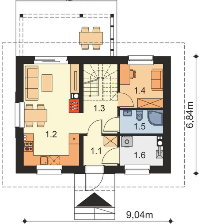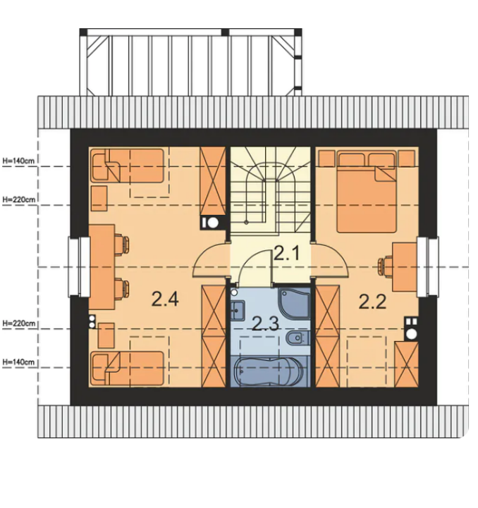 Klasyczna bryła budynku pozwala na zmniejszenie całkowitych kosztów budowy. Dużym atutem jest bardzo dobre wykorzystanie niewielkiej przestrzeni W jej ramach zmieszczono 3 przytulne pokoje. W projekcie uwzględniono również dwie łazienki i toalety.