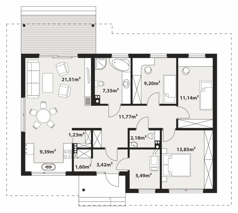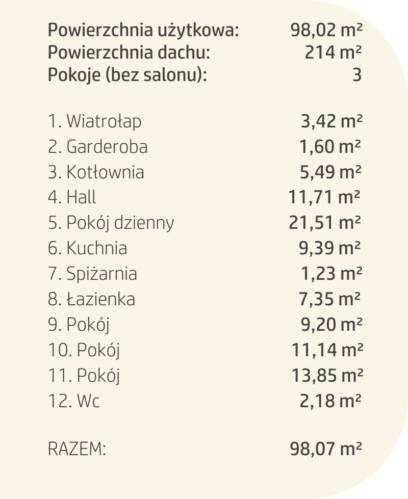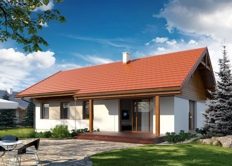 Bilbo drewniany to projekt domu parterowego, który charakteryzuje się optymalnym metrażem 98,07 m2 oraz ustawnymi 3 pokojami. Projekt domu Bilbo Drewniany zakłada duży salon z kuchnią, a także dużą łazienkę oraz dodatkowe WC.
