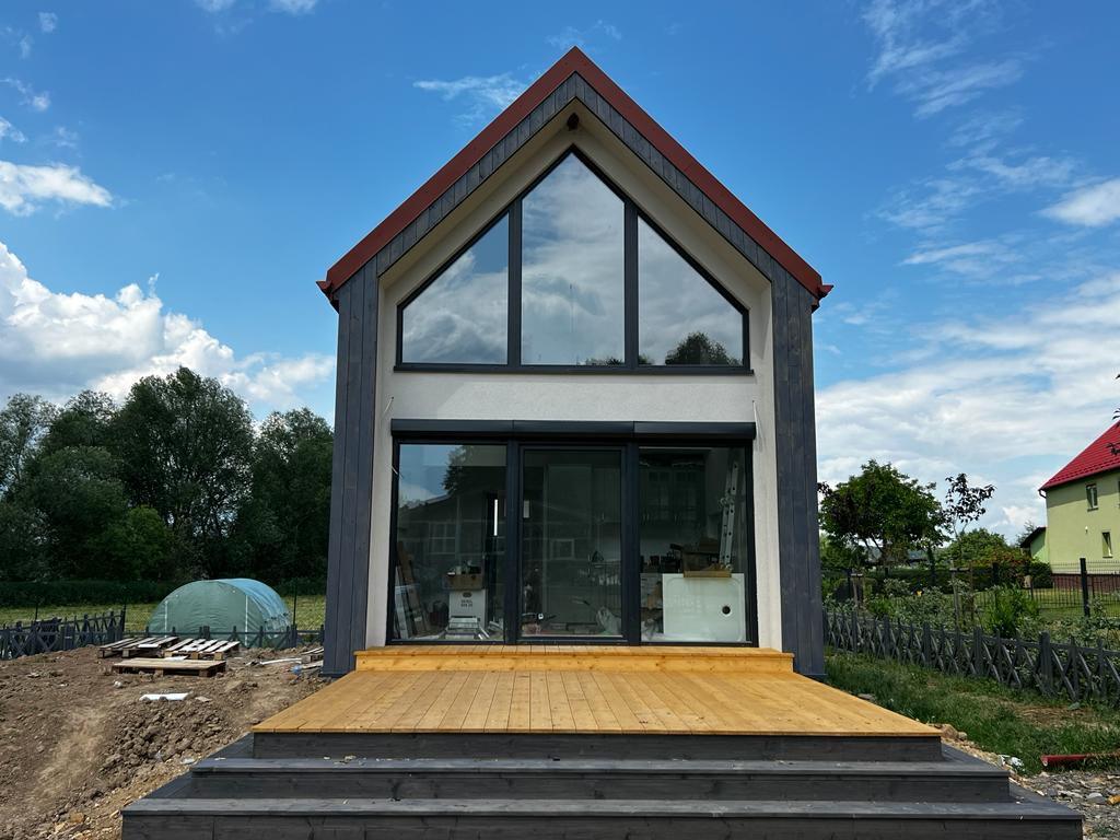 Galeria zdjęć Więcej zdjęć Opis projektu Inwestycja obejmowała wybudowanie domu szkieletowego parterowego o metrażu 100m2 w miejscowości Katowice. Projekt domu zakładał 2 pokoje i łazienkę....