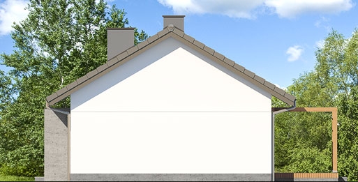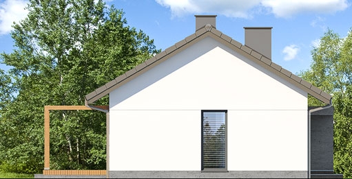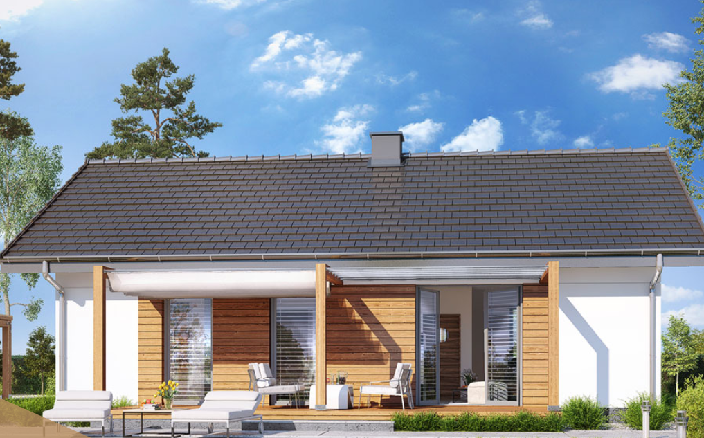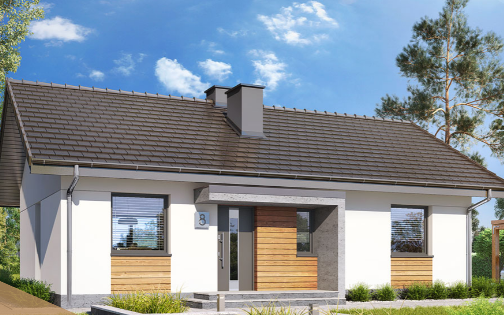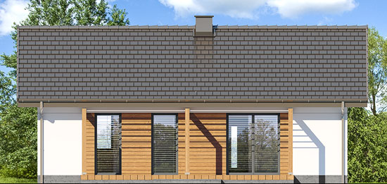 Nowoczesny charakter domu podkreślają drewniane okładziny, ciekawym detalem jest płaskie zadaszenie nad wejściem głównym.