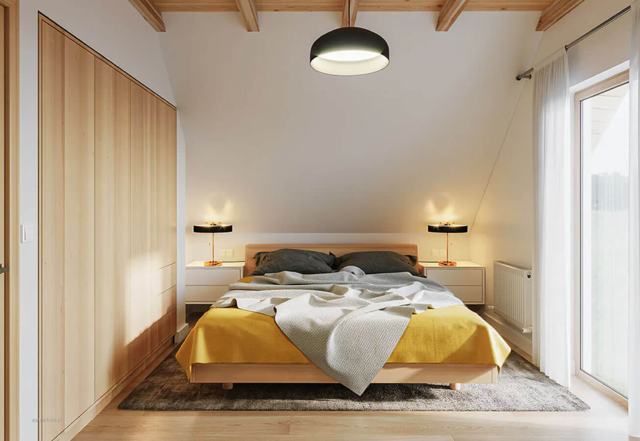 Klasyczna bryła budynku z prostym dachem dwuspadowym pozwala na zmniejszenie całkowitych kosztów budowy. Strefa dzienna pozwala komfortowo prowadzić „ognisko domowe”. Na poddaszu są do użytku dwa oddzielne pokoje przeznaczone na sypialnie.