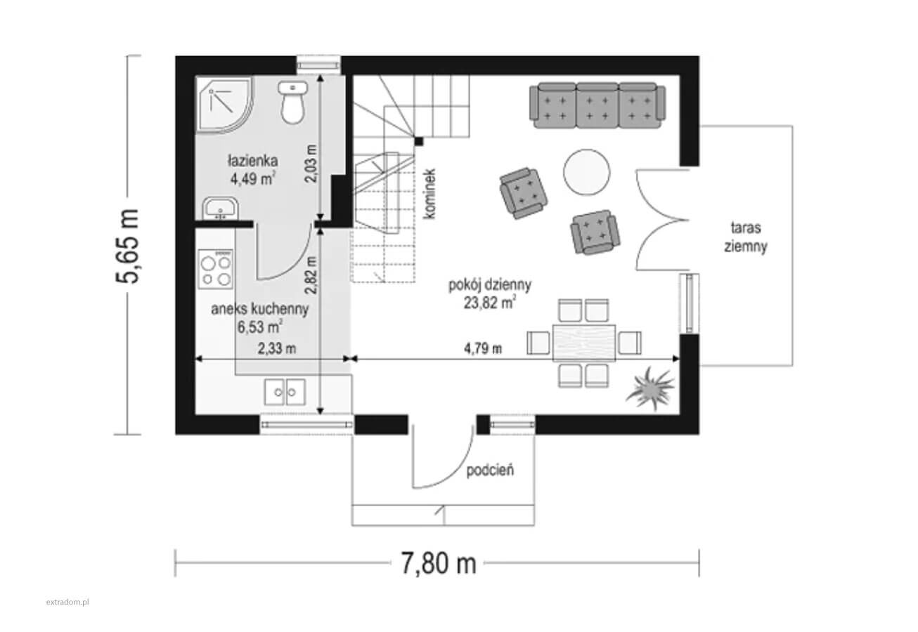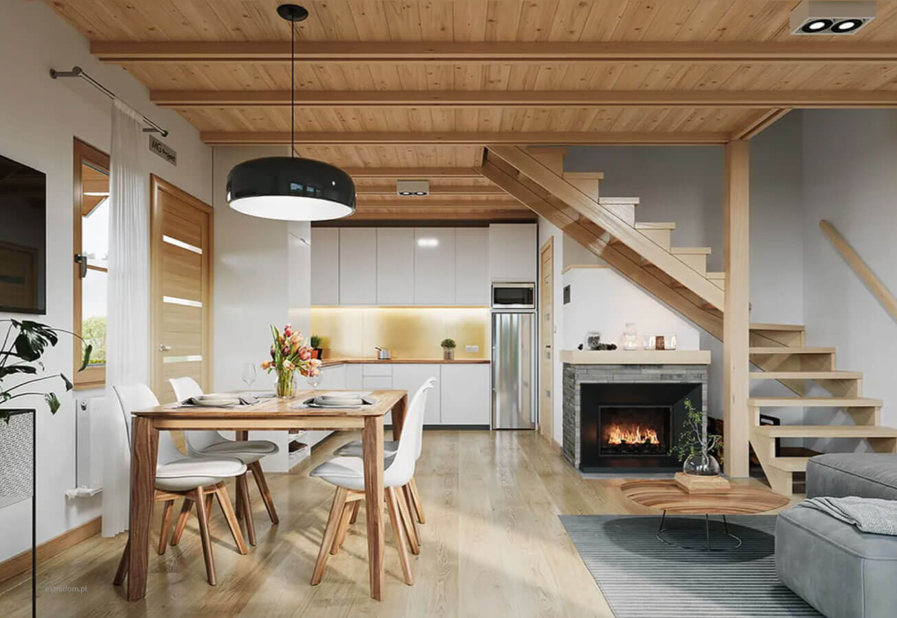 W salonie przewidziane jest miejsce na kominek lub kozę grzewczą, co dodatkowo umili rodzinie wspólne spędzanie czasu jesienno-zimową porą.