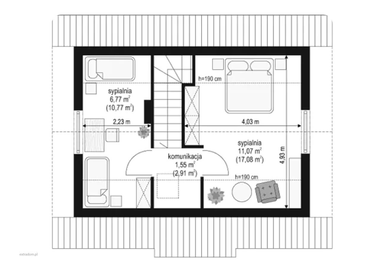 Projekt domu z poddaszem użytkowym, który spełnia potrzeby 2-4 osobowej rodziny.