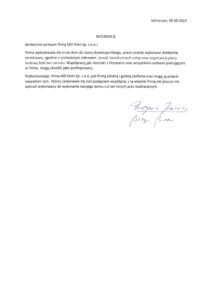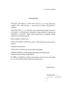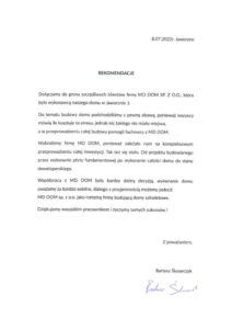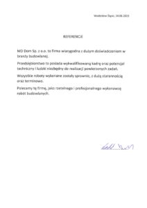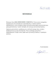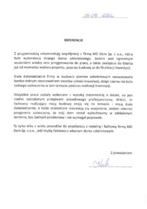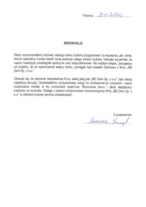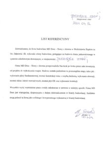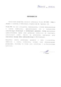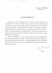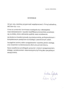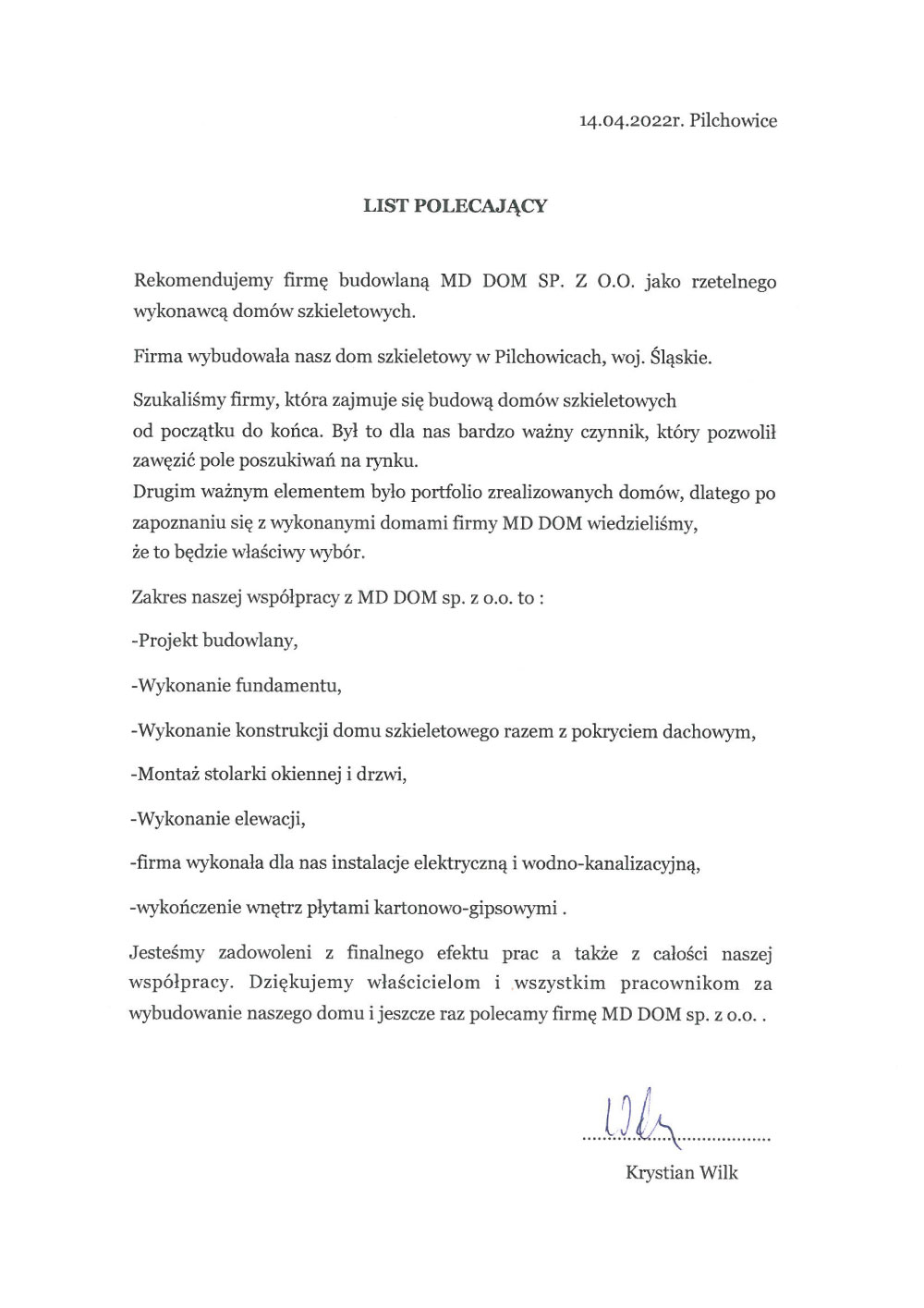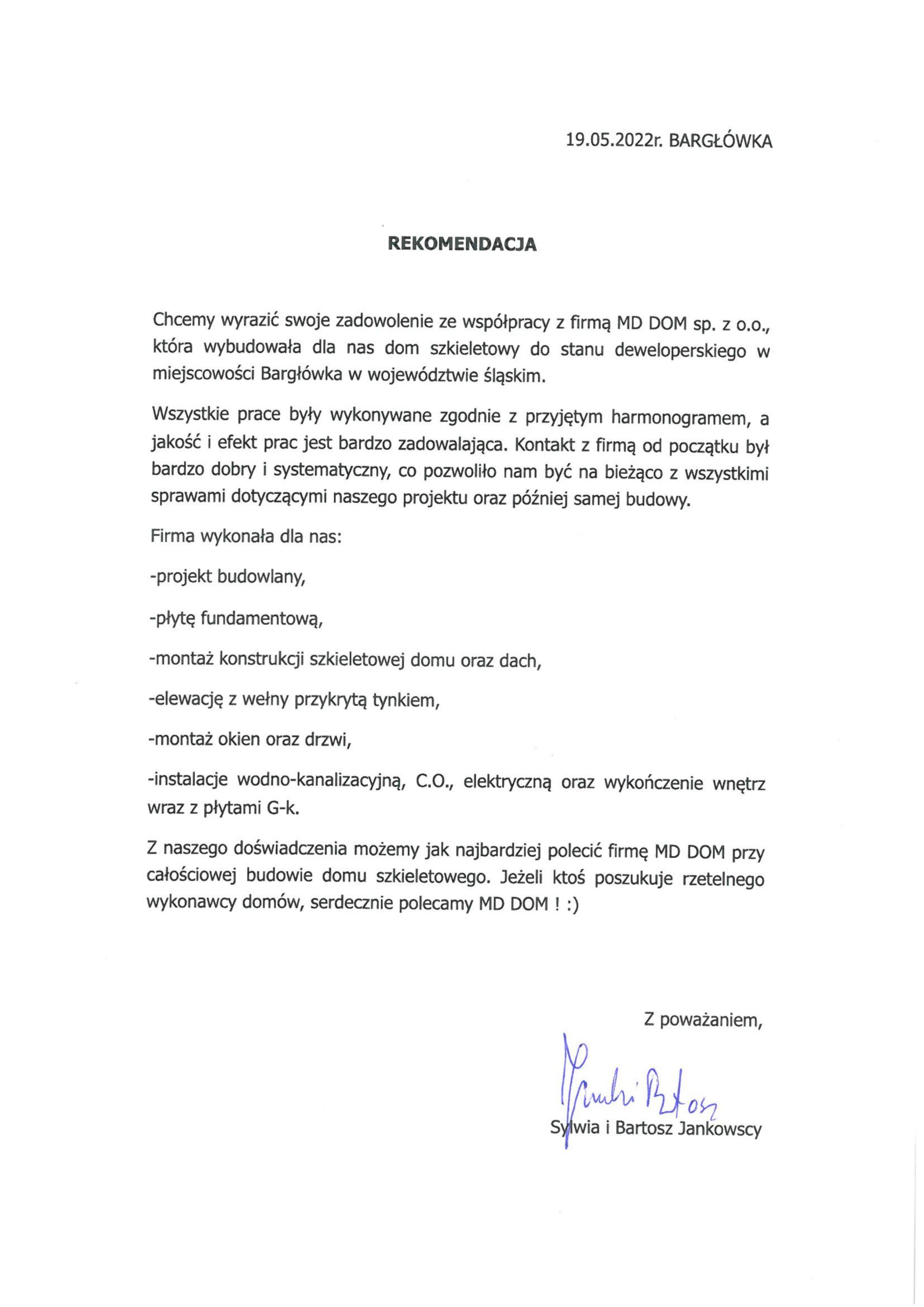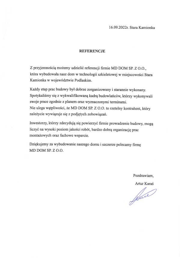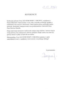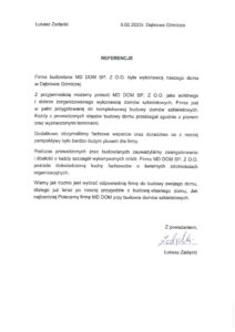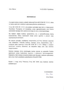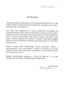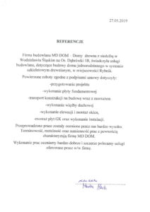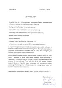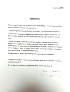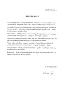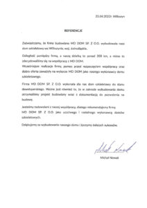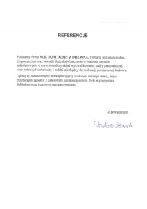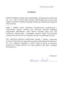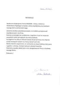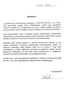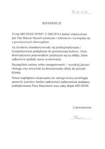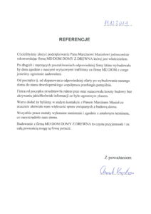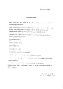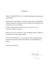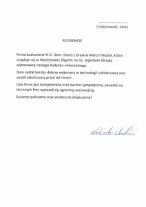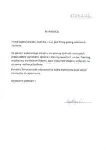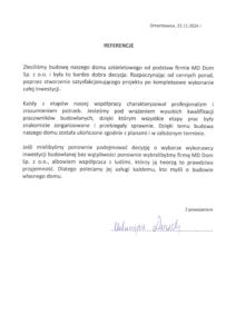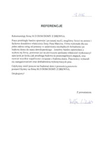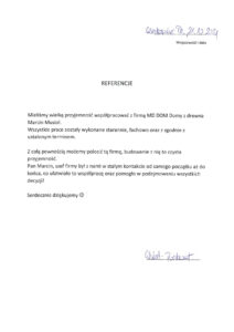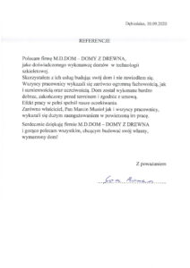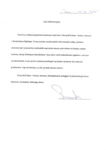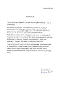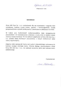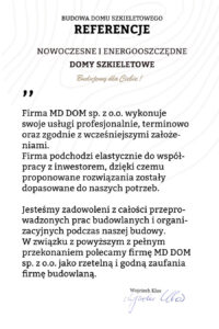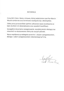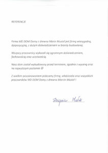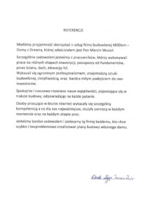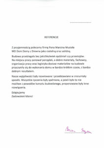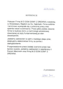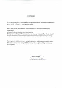 Jako firma MD DOM Domy z drewna posiadamy bardzo pozytywne opinie od naszych inwestorów. Do każdego projektu podchodzimy indywidualnie, dlatego możemy pochwalić się wieloma Referencjami pisemnymi zadowolonych klientów.  Inwestorzy, którzy nam zaufali wiedzą, że wybudowaliśmy dla nich bardzo dobrej jakości dom, który posłuży pokoleniom. O zadowoleniu inwestorów świadczy również fakt, że wielu z nich poleca naszą firmę swoim znajomym, którzy mają w planach budowę własnego domu.