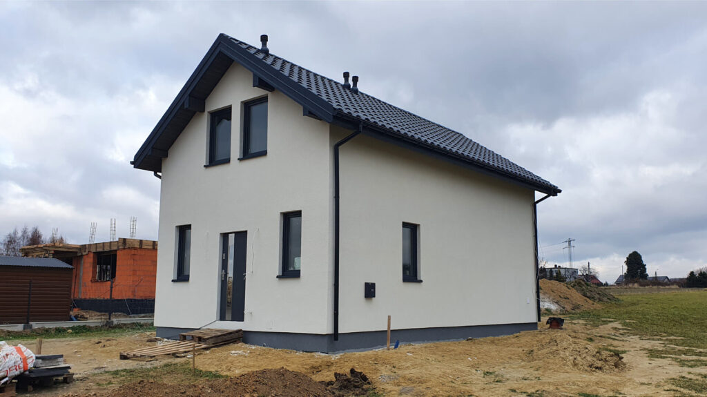 Galeria zdjęć Opis projektu Inwestycja obejmowała wybudowanie domu szkieletowego piętrowego o metrażu 81,42m2 w miejscowości Rogów. Projekt domu zakładał 2
