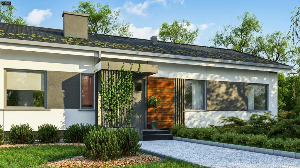 Żabka 3 to projekt domu parterowego z możliwością zaadaptowania poddasza. Strefa dzienna wyraźnie oddzielona od strefy nocnej.