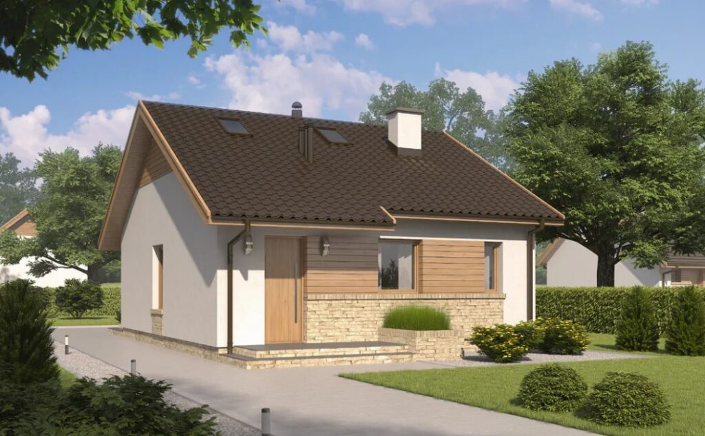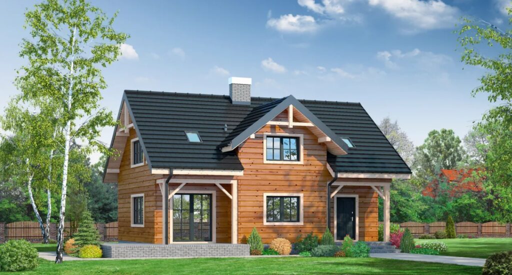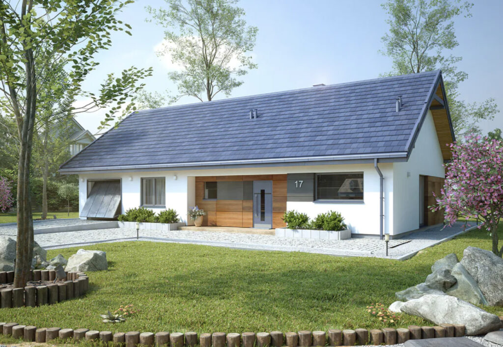 Bilbo drewniany to projekt domu parterowego, który charakteryzuje się optymalnym metrażem 98,07 m2 oraz ustawnymi 3 pokojami. Projekt domu Bilbo Drewniany zakłada duży salon z kuchnią, a także dużą łazienkę oraz dodatkowe WC.