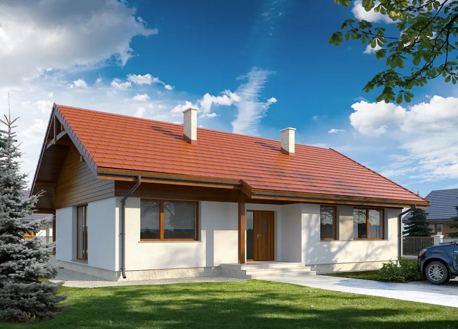 Dom w Awokado to projekt domu parterowego o powierzchni 99,77 m2. Projekt domu zakłada w strefie dziennej duży salon z kuchnią i jadalnią. W kuchni zaaranżowana jest również spiżarnia dla wygody przechowywania żywności. W strefie nocnej znajdują się 3 pokoje (sypialnie) oraz duża łazienka. Główna sypialnia posiada własną łazienkę i garderobę, co pozwoli gospodarzom domu na większą prywatność.
